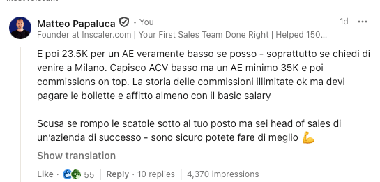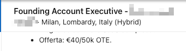 A starting base salary for a sales hire in a city like Milan needs to be around €35-40K.